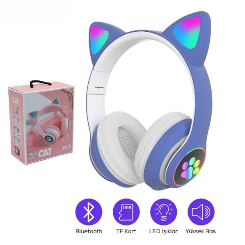 Kedi Figürlü Bluetooth Kulaklık Mavi Renkli